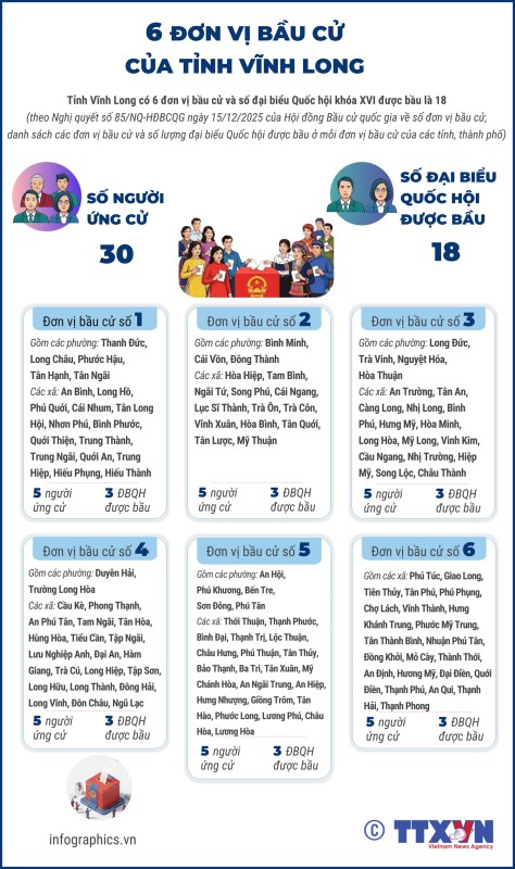 Theo Nghị quyết số 85/NQ-HĐBCQG ngày 15/12/2025 của Hội đồng Bầu cử quốc gia về số đơn vị bầu cử, danh sách các đơn vị bầu cử và số lượng đại biểu Quốc hội được bầu ở mỗi đơn vị bầu cử của các tỉnh, thành phố, Vĩnh Long có 6 đơn vị bầu cử và số đại biểu Quốc hội khóa XVI được bầu là 18.