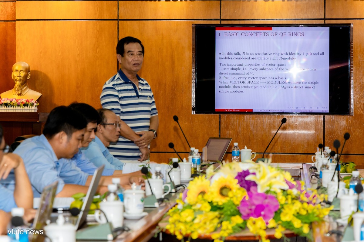 Phát biểu khai mạc hội thảo, GS.TS Lê Văn Thuyết nhấn mạnh: Vai trò quan trọng của Toán học trong việc giải quyết các bài toán thực tiễn của thời đại mới, đặc biệt trong các lĩnh vực kỹ thuật – công nghệ, kinh tế - quản lý, khoa học dữ liệu/AI và giáo dục. Trong buổi hội thảo GS.TS Lê Văn Thuyết trình bày tham luận với chủ đề “On Quasi – Frobenius (QF) rings and Applications to coding theory” báo cáo mở đầu đã thu hút sự quan tâm của đông đảo giảng viên, sinh viên bởi tính ứng dụng cao trong đại số và lý thuyết môđun hiện đại.