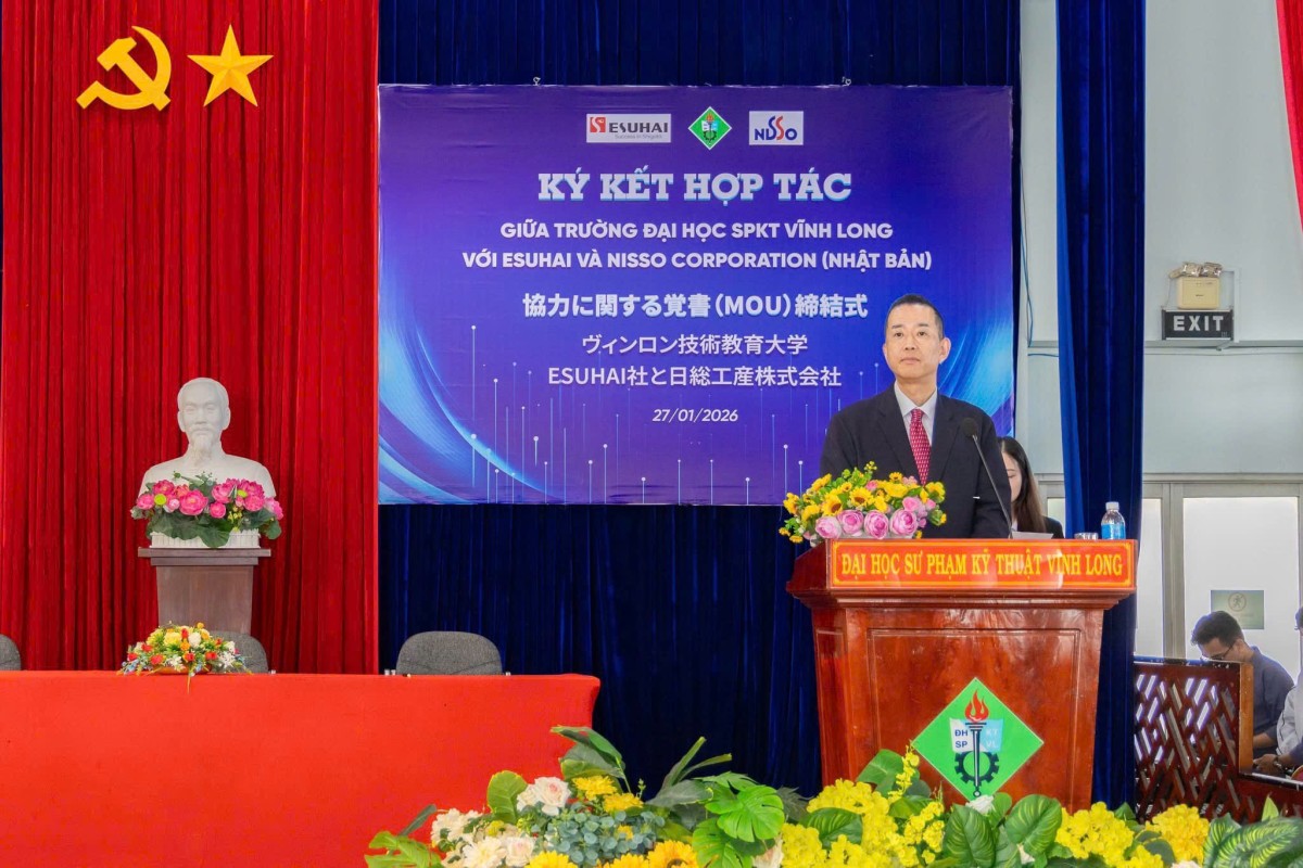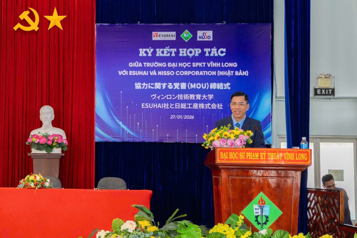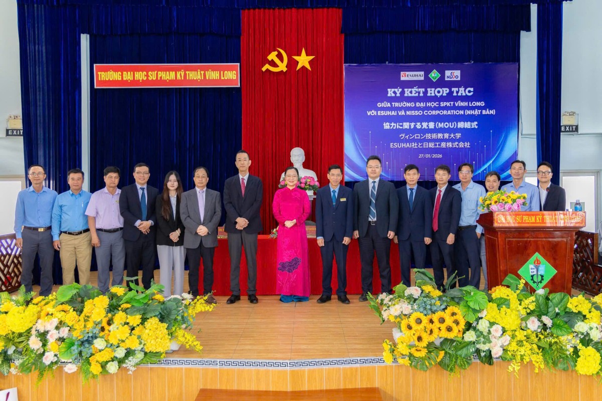 Sáng ngày 27/01/2026, Trường Đại học Sư phạm Kỹ thuật Vĩnh Long (VLUTE) đã tổ chức lễ ký kết hợp tác ba bên với Công ty TNHH Esuhai Technology và Tập đoàn Nisso Corporation (Nhật Bản). Sự kiện đánh dấu bước phát triển quan trọng trong chiến lược đẩy mạnh hợp tác doanh nghiệp – nhà trường, gắn đào tạo với nhu cầu thực tiễn của doanh nghiệp Nhật Bản, đặc biệt đối với khối ngành công nghệ – kỹ thuật.