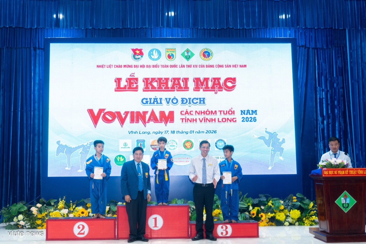 Giải vô địch Vovinam các nhóm tuổi tỉnh Vĩnh Long năm 2026 diễn ra với 58 bộ huy chương ở hai nội dung quyền thuật và đối kháng. Sau những màn tranh tài sôi nổi, quyết liệt và giàu tính chuyên môn, Đội tuyển Vovinam VLUTE đã thi đấu ấn tượng, xuất sắc giành 07 Huy chương Vàng, 04 Huy chương Bạc và 09 Huy chương Đồng qua đó giành giải III toàn đoàn và hơn hết mỗi thành viên VLUTE để lại nhiều dấu ấn tại giải đấu.