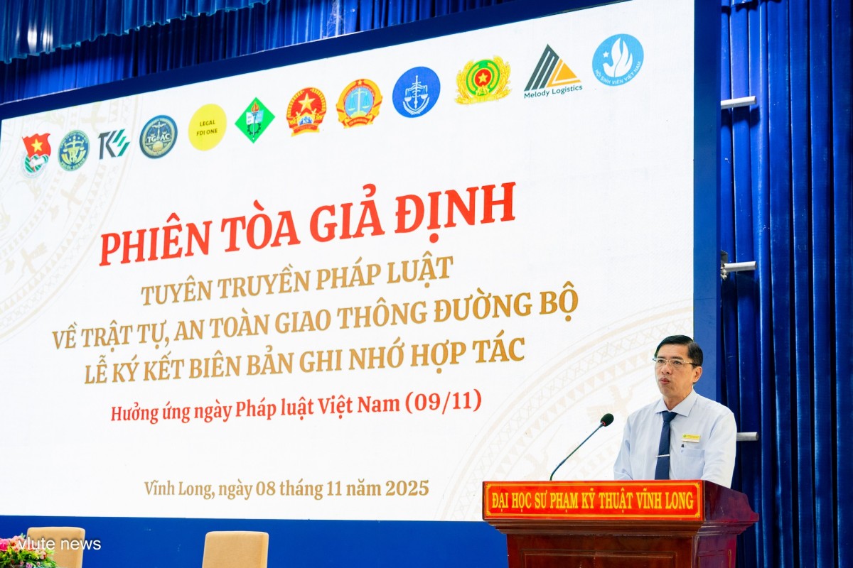 Chào mừng Ngày Pháp luật nước Cộng hòa xã hội chủ nghĩa Việt Nam (09/11), Sáng ngày 08/11, Trường Đại học Sư phạm Kỹ thuật Vĩnh Long (VLUTE) ký kết hợp tác với các cơ quan, doanh nghiệp và tổ chức “phiên tòa giả định” với sự tham dự của lãnh đạo các cơ quan Tư pháp, doanh nghiệp và đông đảo giảng viên, sinh viên.