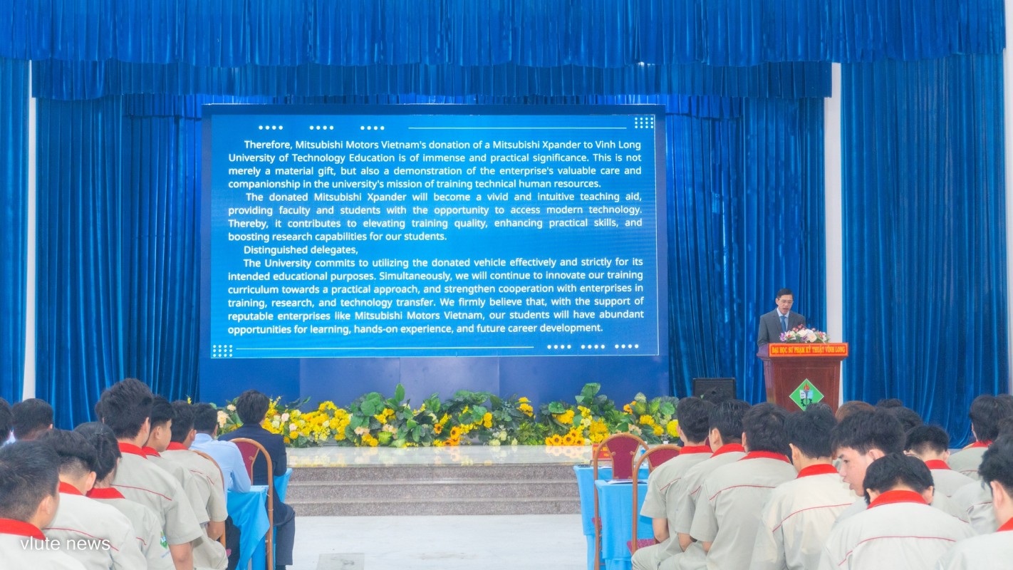 Trong khuôn khổ chương trình, đại diện Mitsubishi Motors Việt Nam và VLUTE đã thực hiện nghi thức trao tặng và tiếp nhận xe trong không khí trang trọng. Việc đưa phương tiện thực tế vào giảng dạy giúp sinh viên ngành Công nghệ kỹ thuật ô tô có cơ hội tiếp cận trực tiếp với cấu tạo, nguyên lý vận hành và các công nghệ hiện đại, góp phần nâng cao kỹ năng thực hành và khả năng thích ứng với môi trường làm việc thực tế.